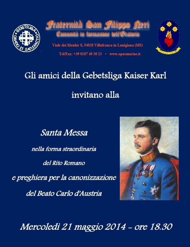 Gli amici della Gebetsliga Kaiser Karl invitano alla Santa Messa e preghiera per la canonizzazione del Beato Carlo d’Austria Mercoledì 21 maggio 2014 – ore 18.30