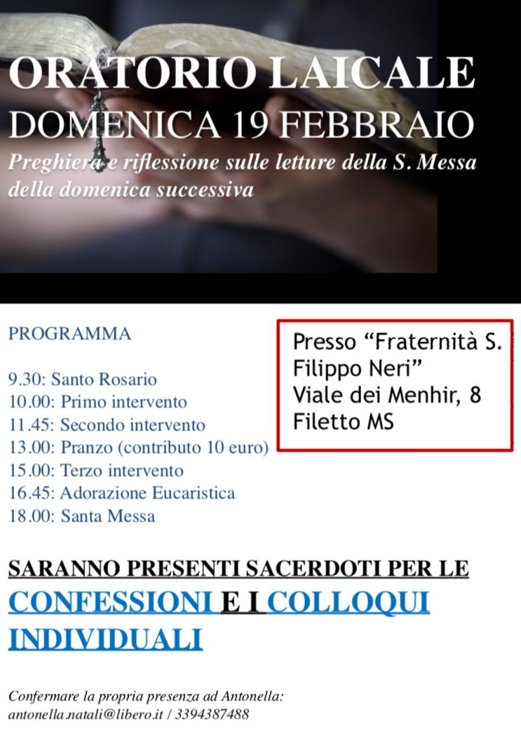 Domenica 12 marzo, nuovo appuntamento con l’Oratorio laicale. Durante la giornata sono previsti interventi di don Piero Cantoni, don Giovanni Poggiali e don Emanuele Borserini. I sacerdoti della nostra Fraternità saranno a disposizione per le confessioni ed eventuali colloqui individuali…. Read More